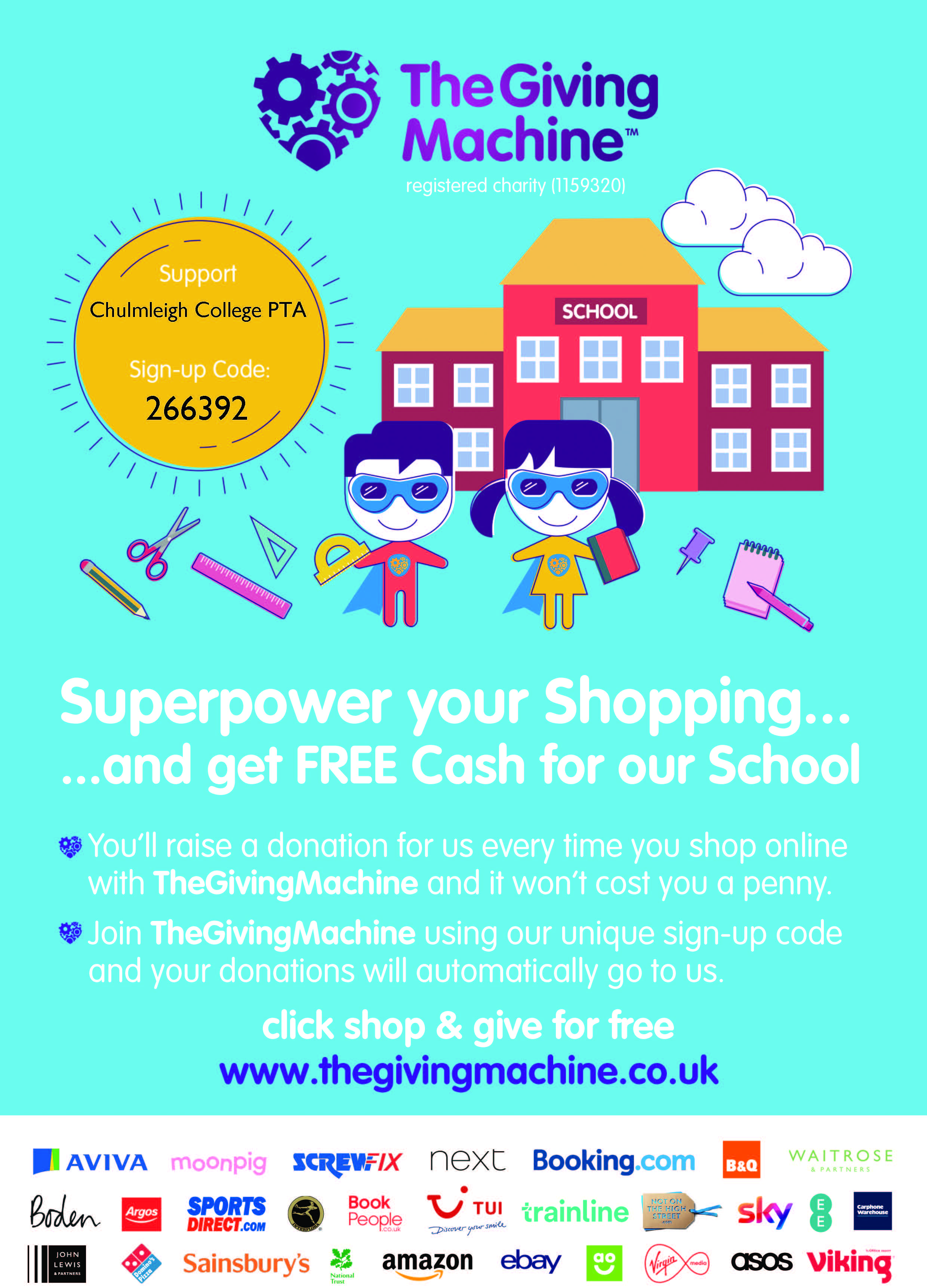 You can support the PTFA from the comfort of your home by shopping online through The Giving Machine using our unique code 266392. With over 2,000 retailers including Amazon, Argos, John Lewis, and Boots, it's an easy way to give back—at no extra cost to you!